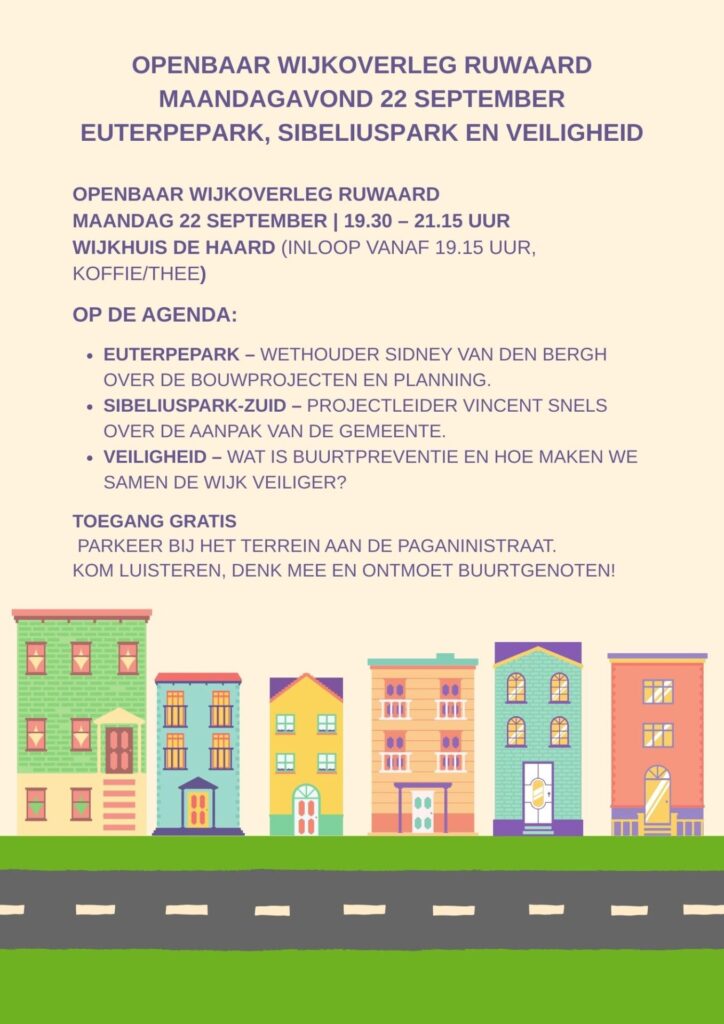 Op maandag 22 september organiseert Wijkraad Ruwaard het Openbaar Wijkoverleg.