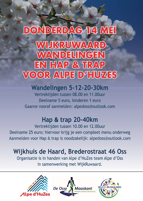 Op Hemelvaartsdag donderdag 14 mei 2026 organiseert team Alpe d’Oss weer de wijk Ruwaard Wandeling voor Alpe d’HuZes.