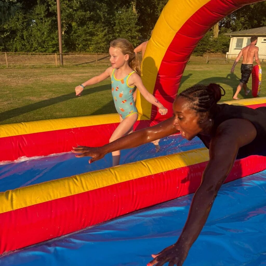 Het absolute hoogtepunt overdag? De gigantische buikschuifbaan. Daar bleek al snel dat leeftijd écht geen rol speelt – van kinderen tot stoere vaders, iedereen gleed met een brede grijns (en soms een mondvol gras) naar beneden.