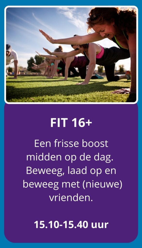 Heb je een drukke studie- of werkdag en kun je wel even een frisse boost gebruiken? Stop met binnen zitten en kom naar buiten! FIT 16+ is een toegankelijke training midden op de middag, speciaal voor iedereen die fit wil blijven in een gezellige groep.