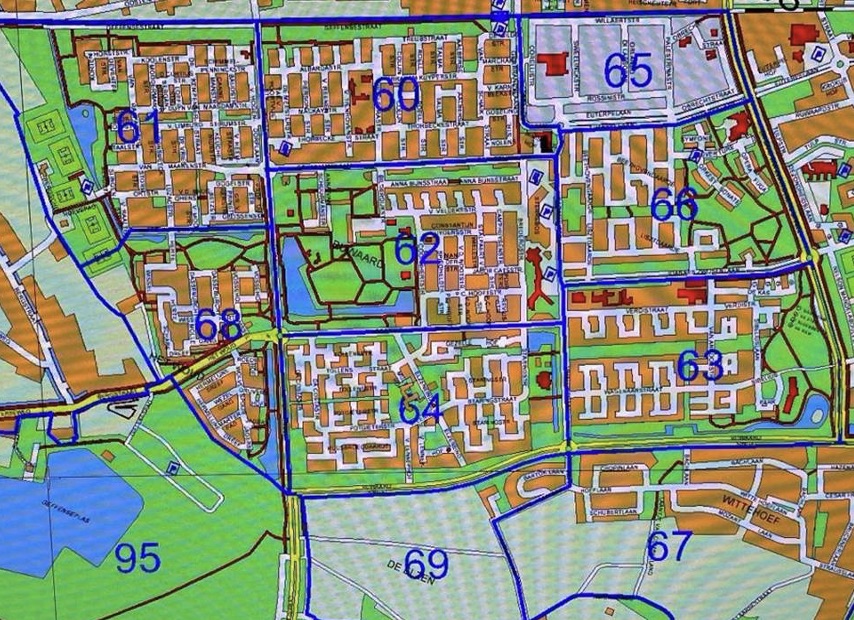 Zie onderstaande platte grond van de Ruwaard met de ingetekende buurten.