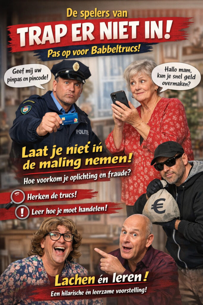 De spelers van Trap er niet in! Reizen al enkele jaren door het land met hun voorstellingen over Babbeltrucs. Met scenes die uit het leven gegrepen zijn, nemen zij het publiek mee naar alledaagse situaties waarbij mensen voor de gek worden gehouden met babbeltrucs.