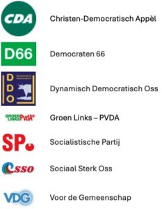 Na afloop van de presentatie staan de 7 onderstaande Osse politieke partijen klaar om uw vragen te beantwoorden.
