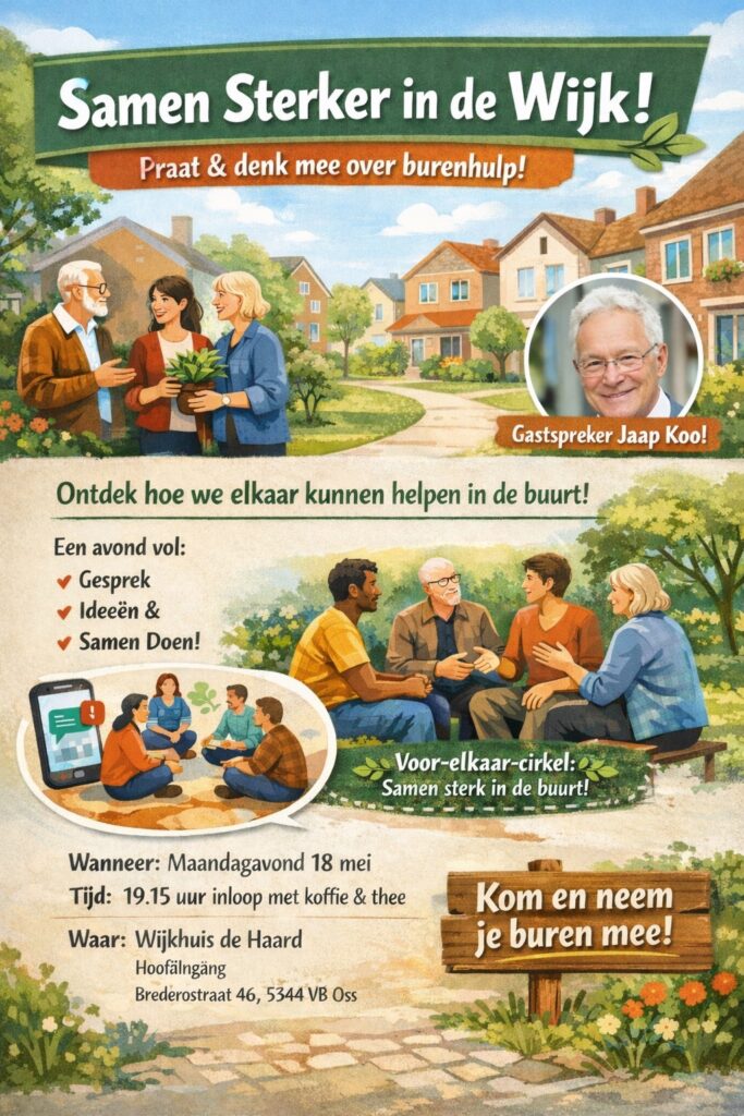 Maar ook een zogenaamde “voor-elkaar-cirkel” is een idee. Een “voor-elkaar-cirkel” is een kleine groep buurtbewoners die elkaar praktisch en sociaal ondersteunen. In Oss wordt hier werk van gemaakt!